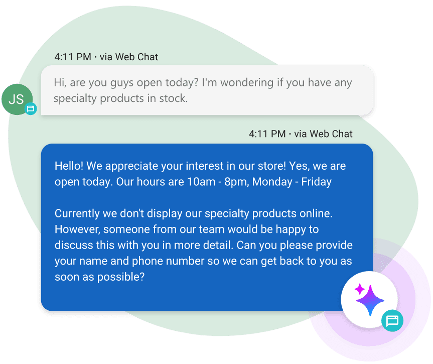 Ensure prompt engagement with new leads. Your business can rely on AI-assisted web chat to maintain open lines of communication during peak times such as the dinner rush, the daily school run, or after hours. The AI-assisted web chat lead capture greets website visitors instantly and collects their contact information for follow-up. Additionally, you can customize the knowledge base to enhance the web chat widget’s capability to answer inquiries about business hours, services, and more.